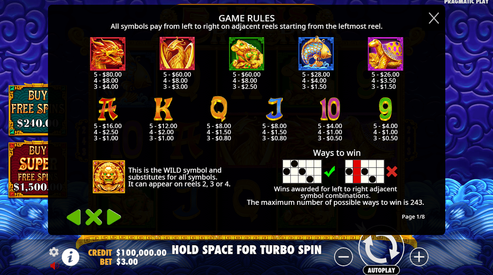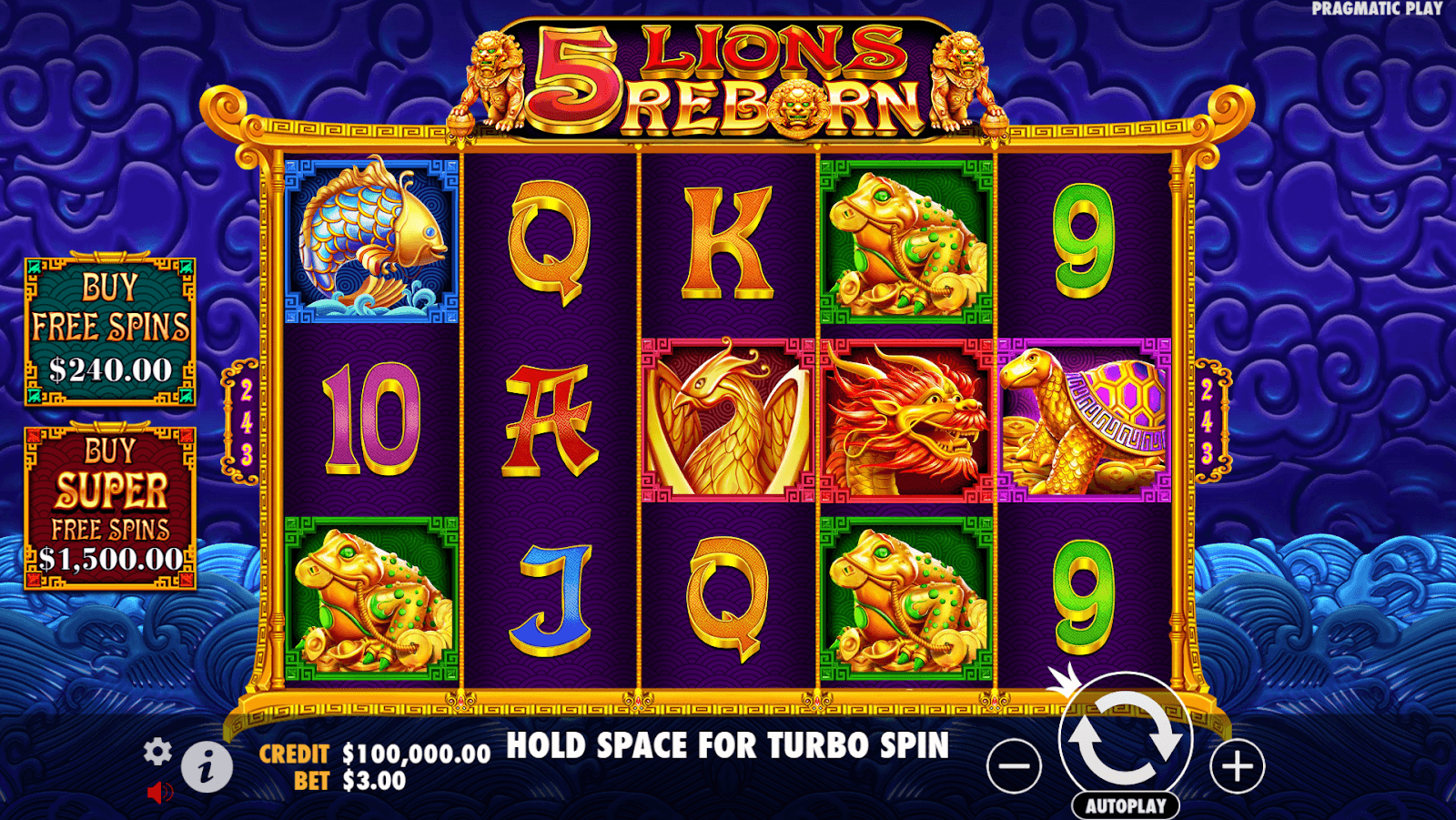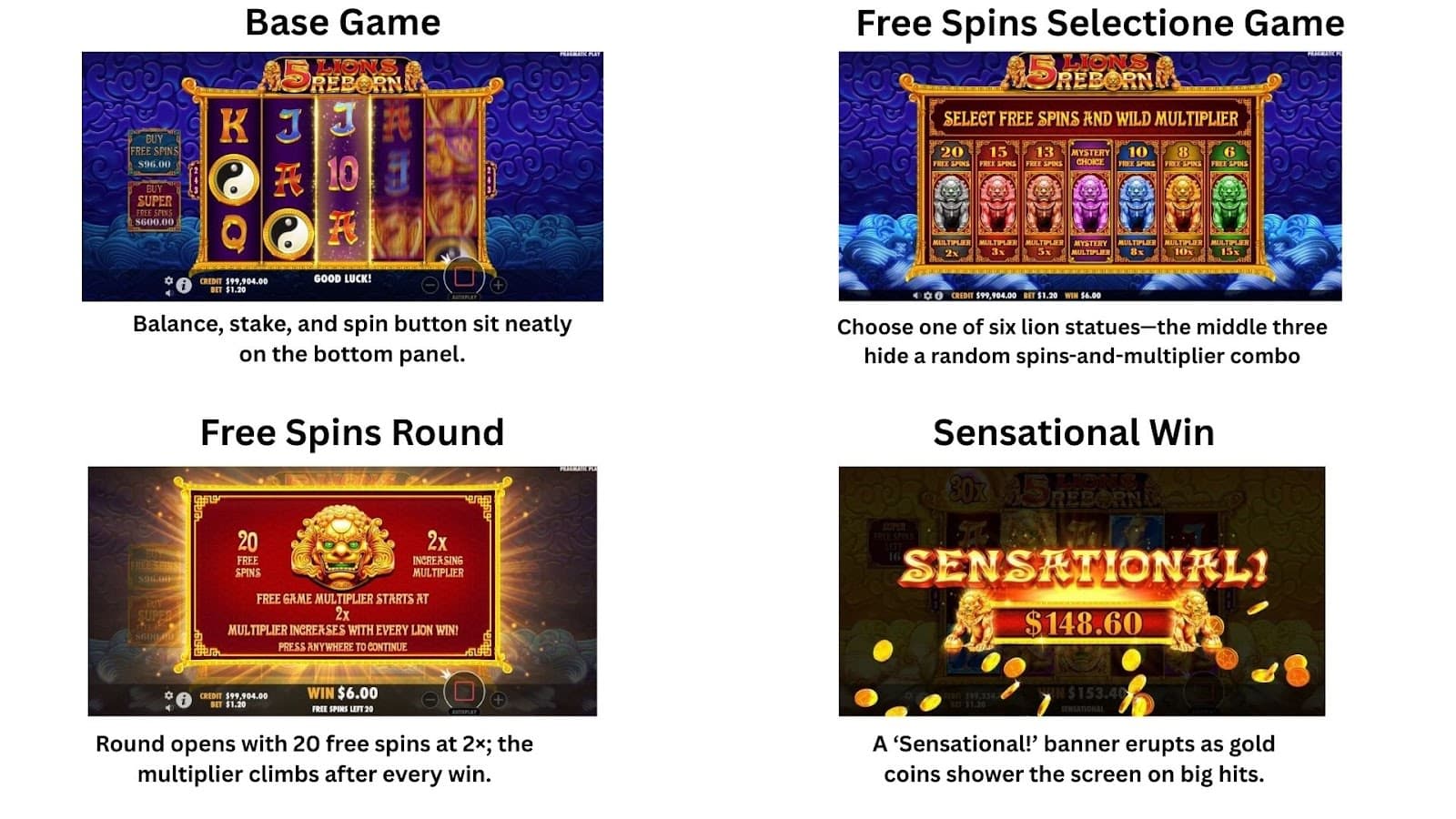 “5 Lions Reborn”, sukūrė Pragmatiškas žaidimas, yra žavus didelio nepastovumo lizdas, kuris kviečia žaidėjus į mitinę nefrito šventyklą, šurmuliuojančią auksiniais žvėrimis. Jis sukasi ant 5 × 3 tinklelio su 243 būdais laimėti, turtinga 96.50% RTP ir statymai nuo €0.30 iki €240. Turbo ir 1-1 000 automatinių sukimų palaiko tempą žvalų, o “Feature Buy” (80 × standartiniams nemokamiems sukimams arba 500 × super nemokamiems sukimams) suteikia akimirksniu adrenalino. Bazinis žaidimas jaudulys ateina iš sukrauti priemokų ir drakonas laukinių vežančių atsitiktinių 2-35 × daugikliai.