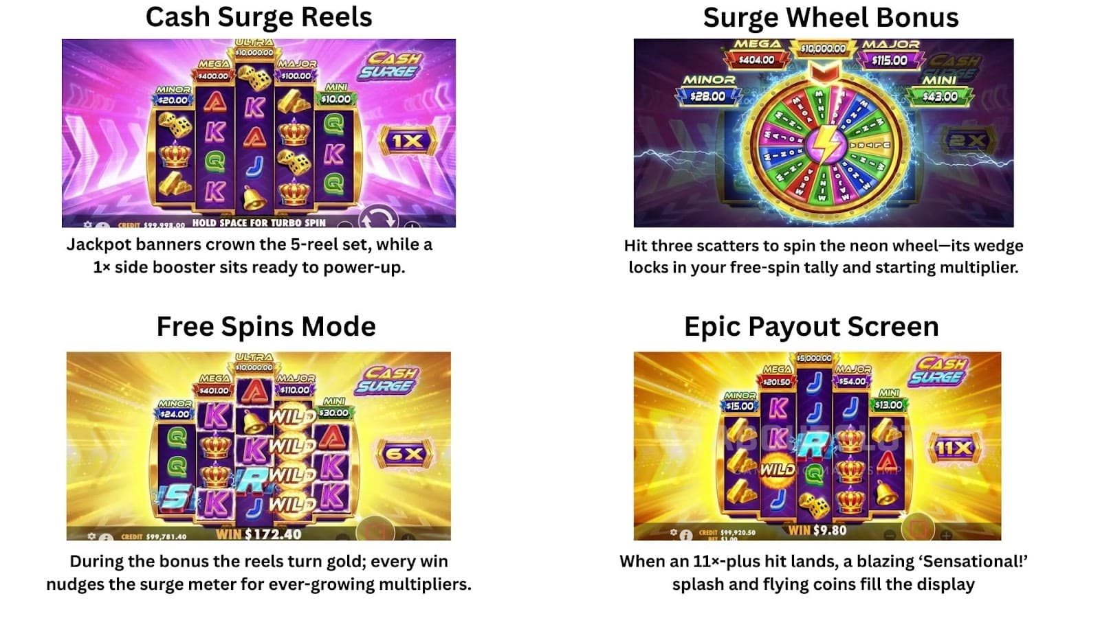 Išsklaidykite raidės prilimpa, kol rašote SURGE, paleisdami keturis Free Spins. Naujos raidės prideda sukimų, o žaibas vis tiek gali smūgiuoti arba apdovanoti progresyvią-todėl 5 000 × Ultra prizas įmanomas per vieną zap. Be jokių Feature Buy, kantrybė ir bankroll valdymas yra raktas; daugelis žaidėjų statyti progresyvus į bazinį žaidimą prieš sprogo.